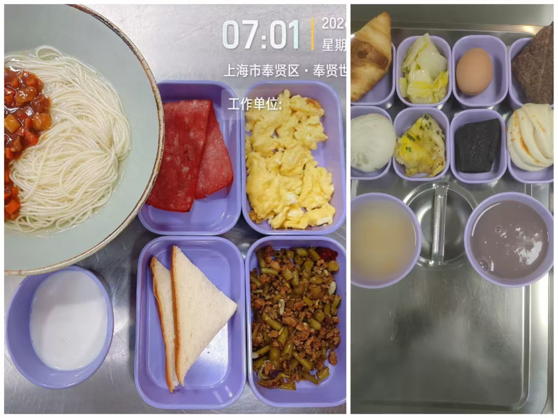 早餐面档:宫爆肉丁面(肉丁40g、面条100g)、肉沫豇豆(肉糜10g、豇豆60g)